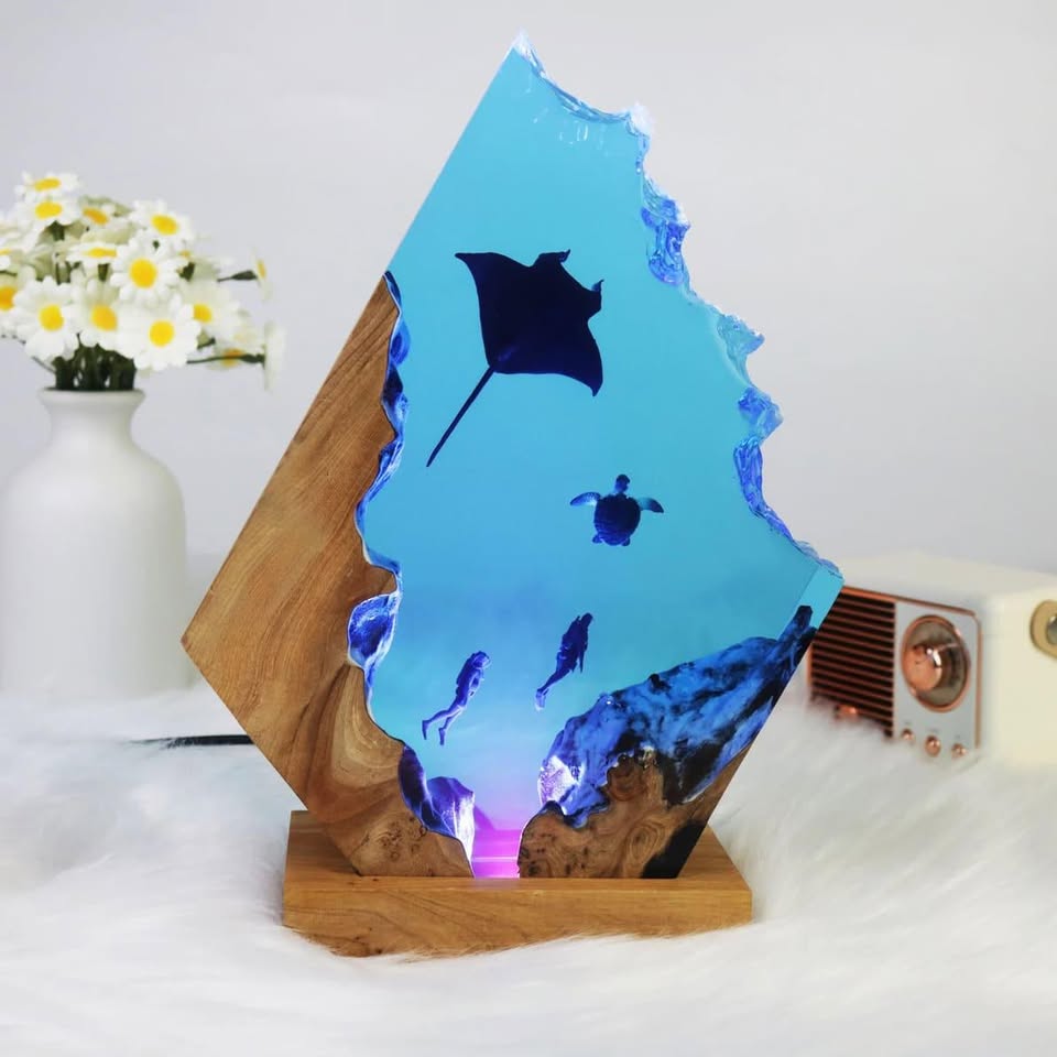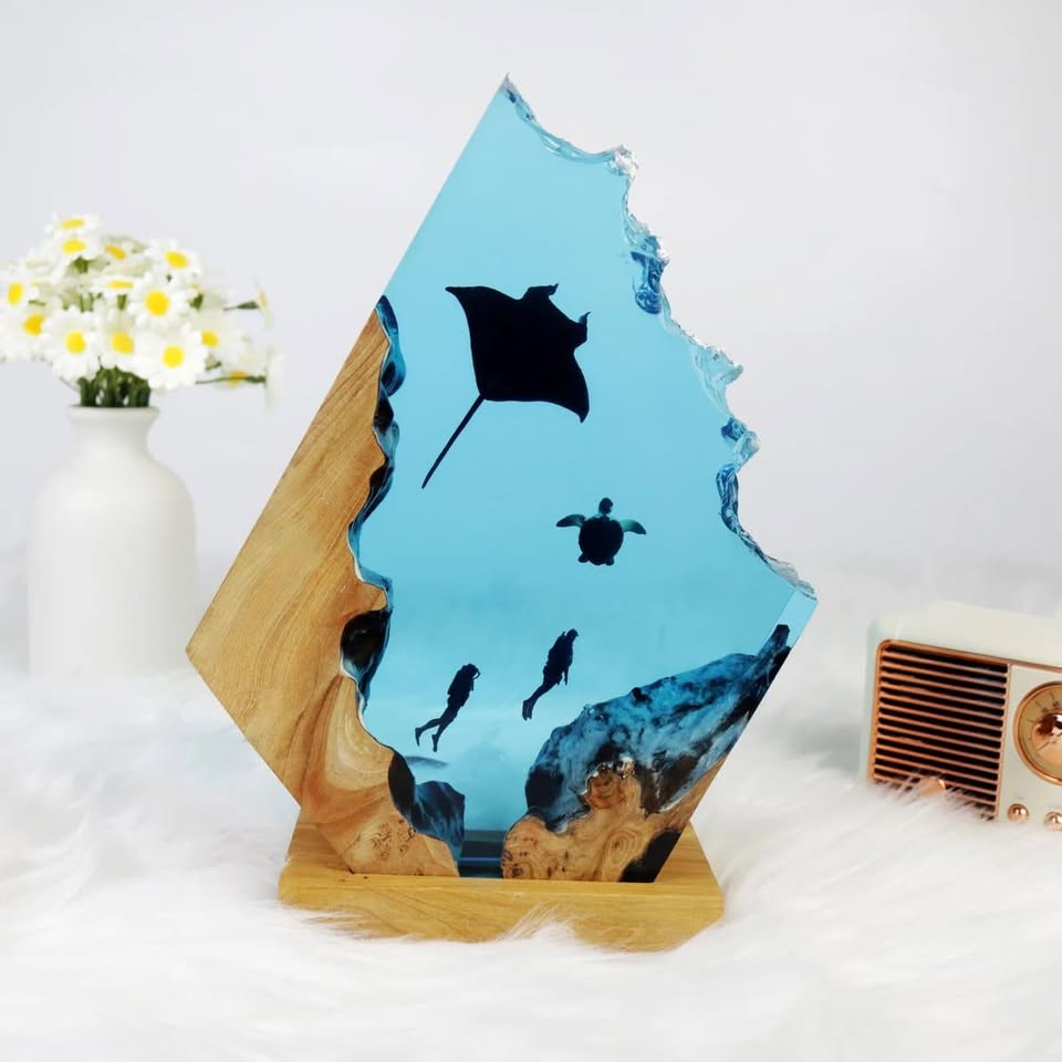 Manta ray, turtle, diver, wood sculpture, epoxy resin lamp( Best Gift 🎁 )