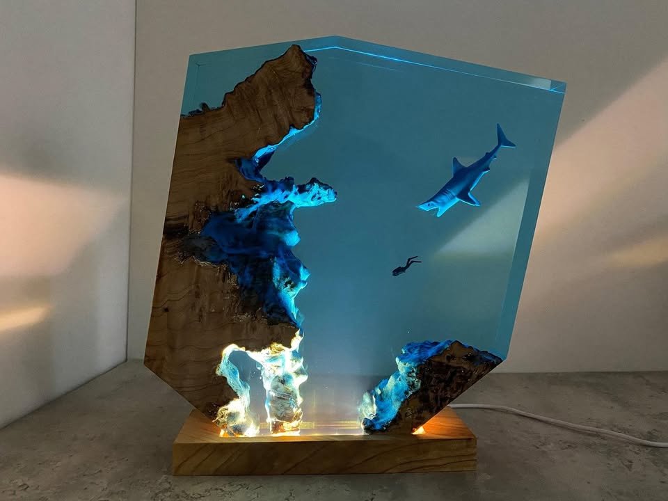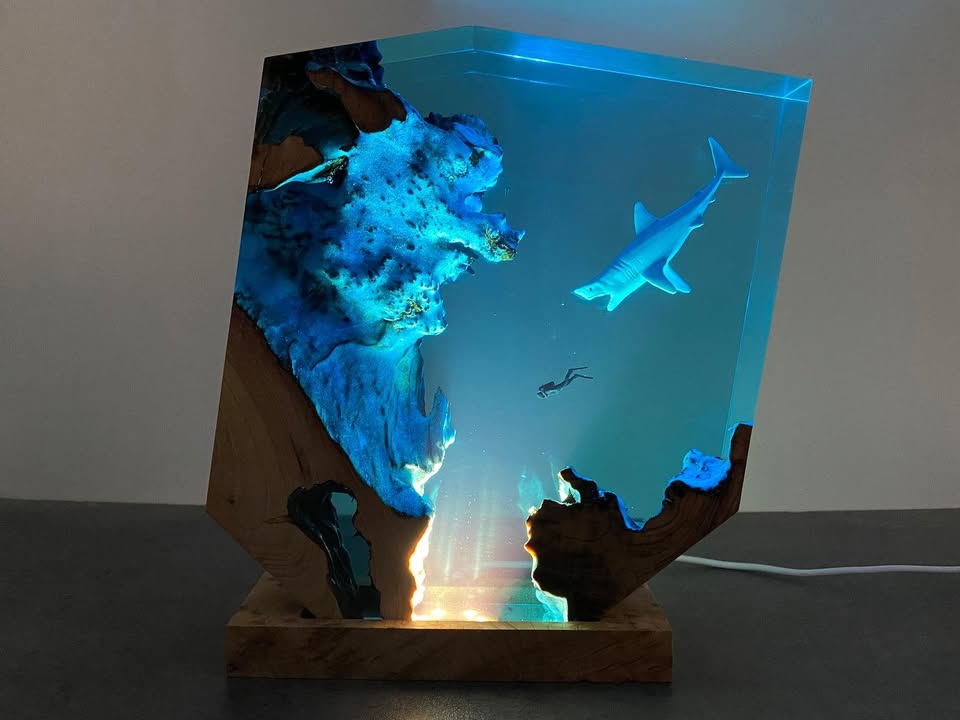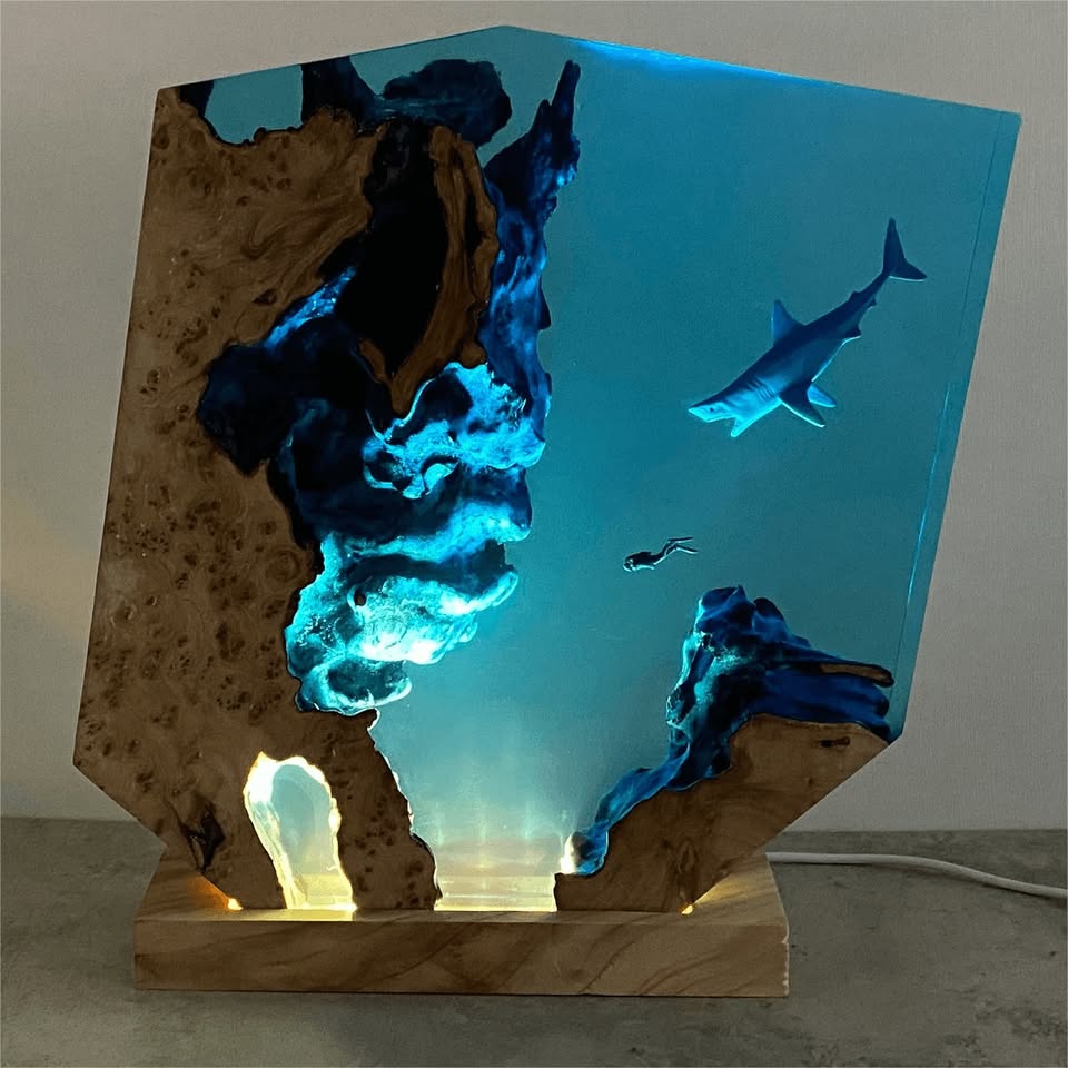 Sharks, divers, wood sculptures, epoxy resin lamp ( Best Gift 🎁 )